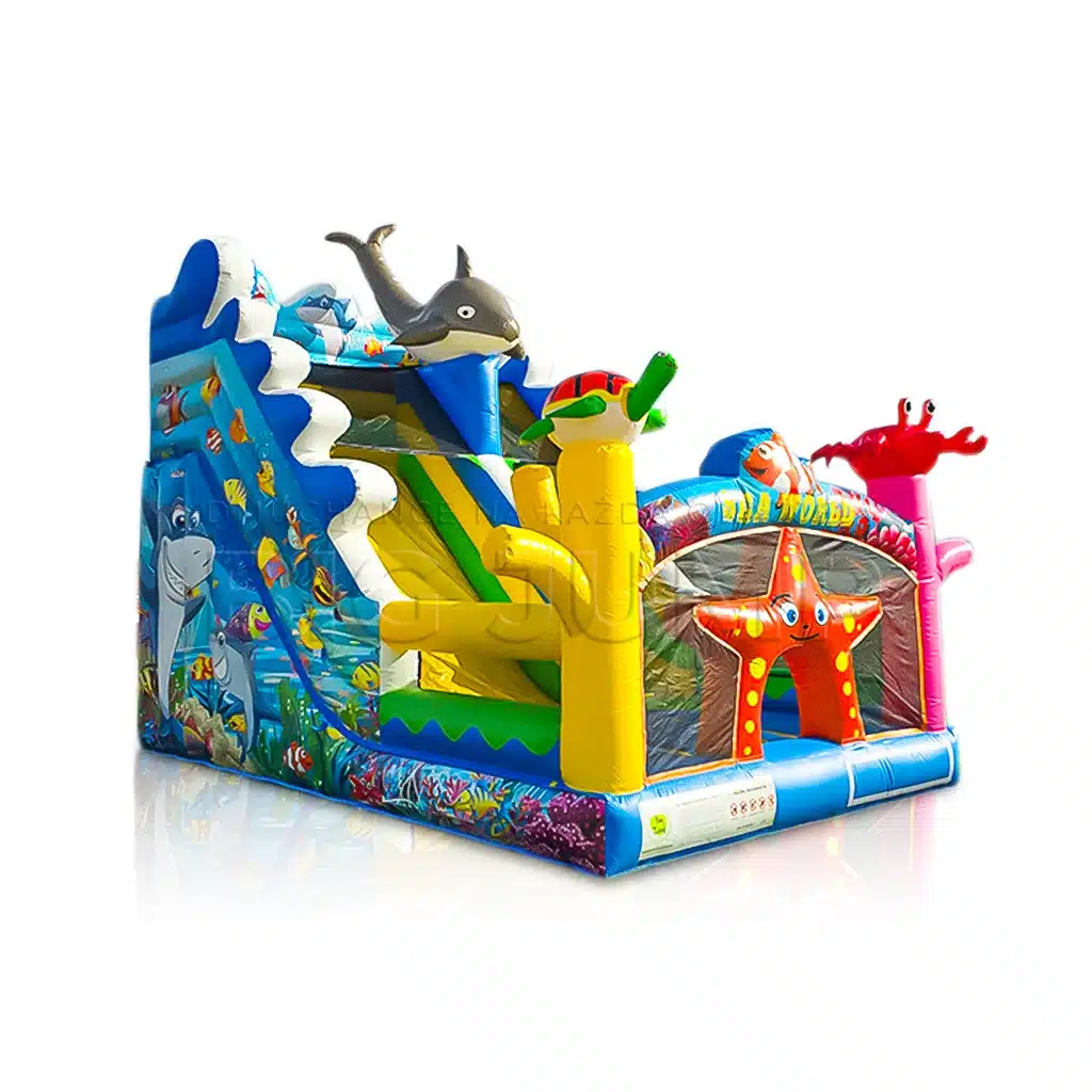 Dmuchana zjeżdżalnia Podwodna Przygoda to idealne rozwiązanie dla każdej grupy odbiorców, na każdą imprezę plenerową. Bez względu na wiek, nasze zjeżdżalnie oferują radość zarówno dla maluchów, jak i starszych dzieci, dostosowując się do różnorodnych potrzeb rozrywki. Jest to najbardziej uniwersalny dmuchaniec.
